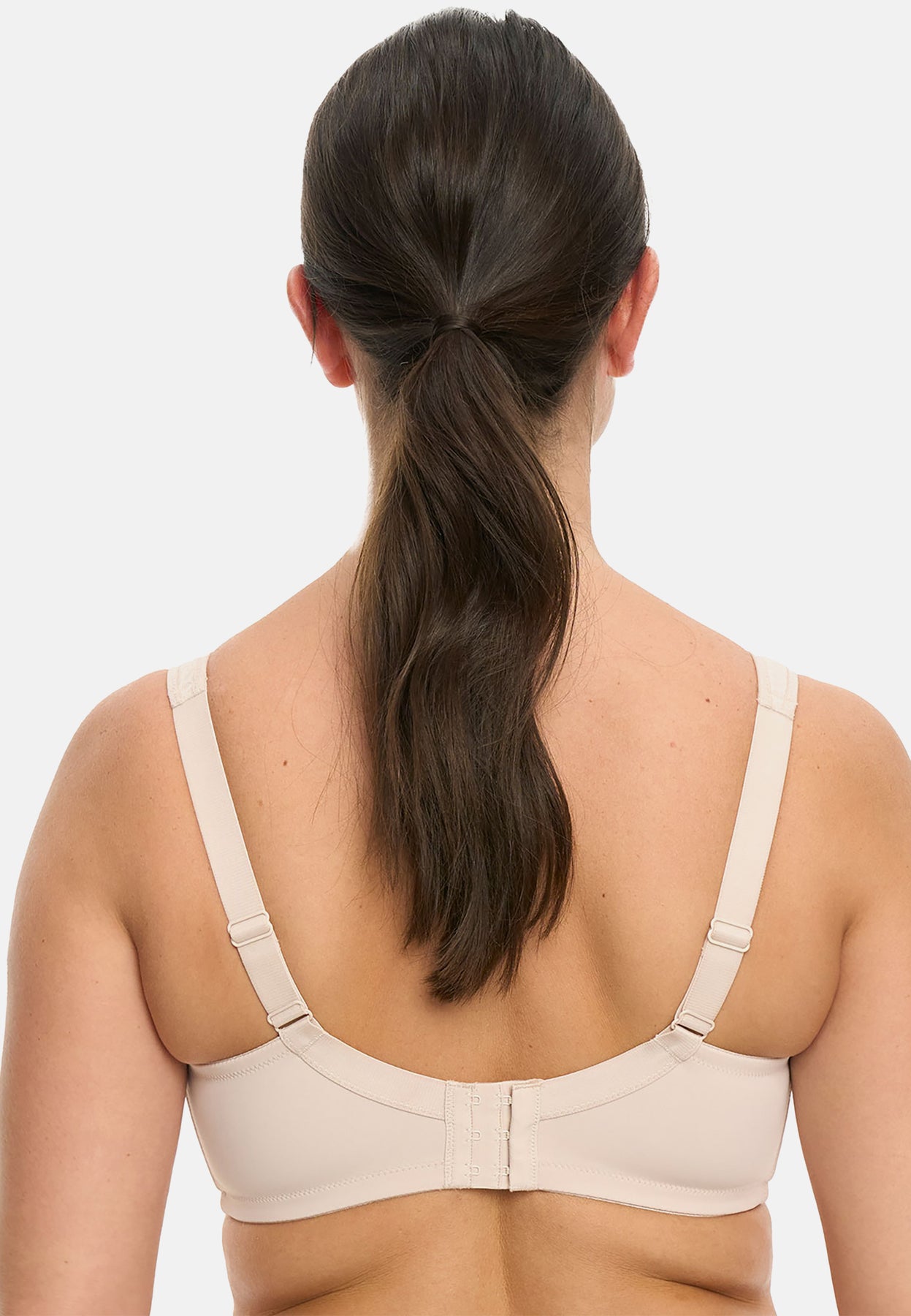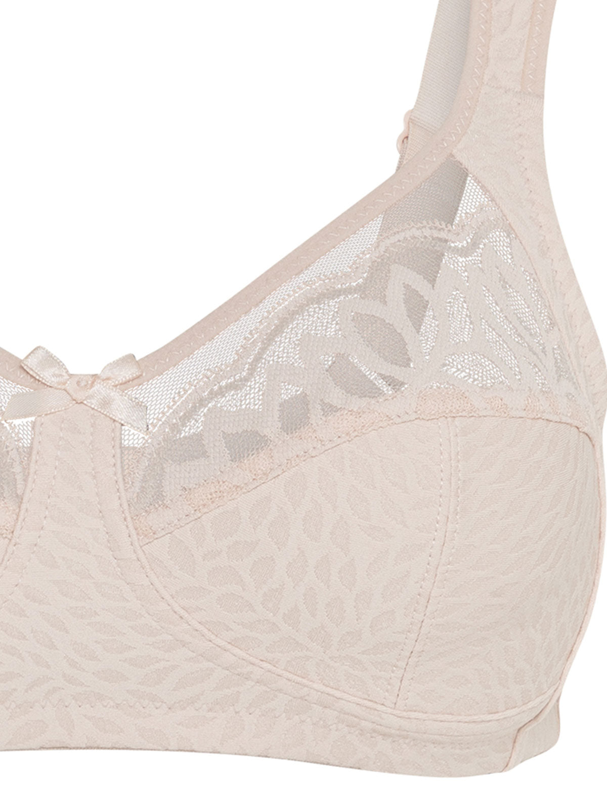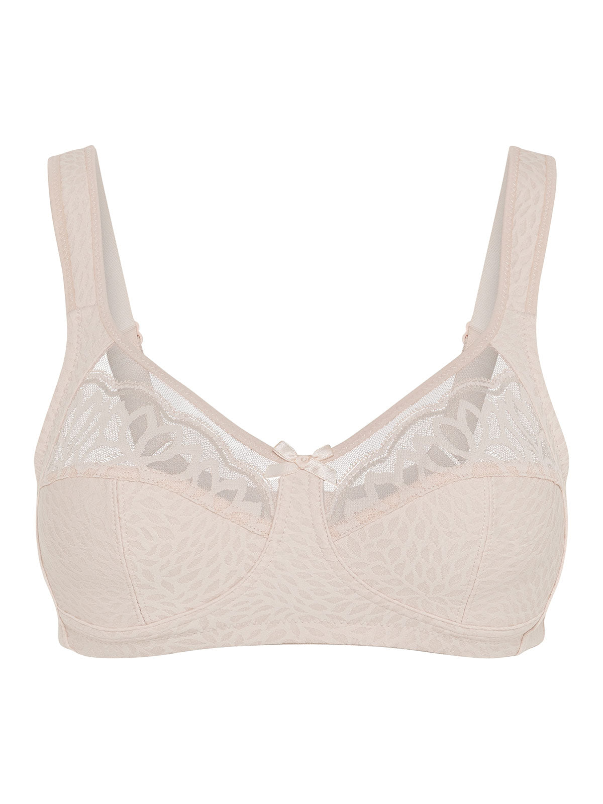 Descubre la comodidad atemporal con este sujetador clásico sin aros, diseñado para ofrecer un soporte impecable incluso en tallas grandes. Sus copas cosidas y su elegante tejido jacquard con detalles de encaje en forma de hojas aportan un toque femenino, mientras que la banda bajo el busto asegura un ajuste firme durante todo el día.