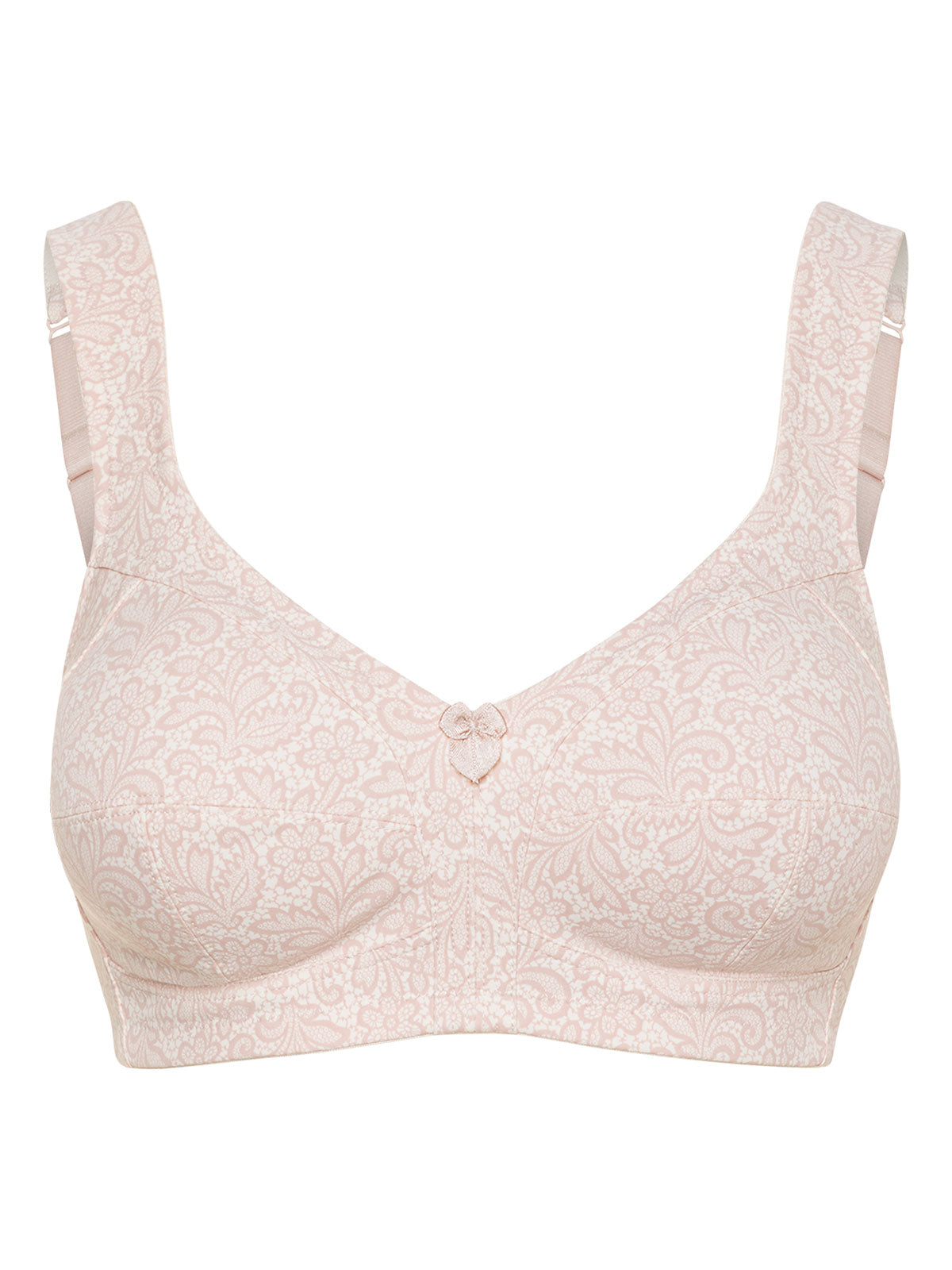 Disfruta de la perfecta combinación de comodidad y estilo con este sujetador sin aros de diseño estampado. Con copas cosidas en tres piezas y una banda ancha bajo el pecho, ofrece una sujeción óptima incluso en tallas grandes. Su tacto suave gracias al algodón y sus tirantes anchos y ajustables lo convierten en una prenda ideal para el día a día.